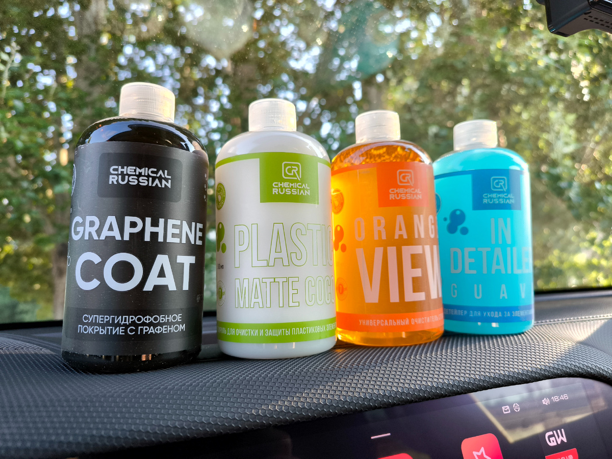 Не реклама!!! Не являюсь профессиональным детейлером, а только учусь поэтому пишите свои замечания в комменты. Всем привет! Вот наконец я дошел до того, что обзавелся автокосметикой для своего железного питомца. Взял небольшой скромный набор от молодого отечественного бренда подающего надежды – Chemical Russian, а именно: очиститель стекол с запахом апельсинки; квик детейлер для очистки различных элементов салона в том числе экранов и сидений с каким то прикольным ароматом, полироль для грубого пластика, которого хватает в Дарго; и решил попробовать новое гидрофобное покрытие на базе графена, ранее использовал кварц. И так по порядку: пришла химия сами емкости, что радует объемом пол литра – хватит на долго, распылители с коробки идут не прикрученными, видимо, чтобы не протекло и свежее были составы. Первым делом испытал что попроще – очиститель стекол, результат меня порадовал пару пшиков один раз протер микрофиброй и стекла стали гораздо чище и прозрачней за этот состав ставлю палец