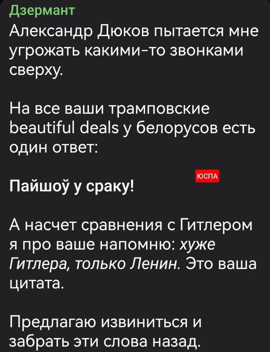 Дюков предложил Дзерманту присоединиться к его агентурной сети, на существование которой намекают в телеграме, для совместной работы на российскую аудиторию, но белорусский социалист пока вытирает о разоблачителя мифа о Калиновском ноги и торгуется.