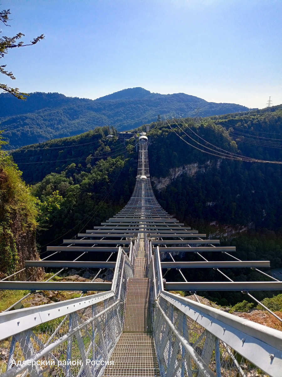 Этот рассказ — продолжение предыдущего: После пещеры нас ждал парк Скайлайн, поэтому, чуть отдышавшись, мы отправились в путь. Сразу возле кассы был указатель, куда идти, чтобы добраться до парка по тропинке. Можно было пройти по дороге, но это в два раза дольше. Нас ожидал 15-минутный подъём по бездорожью, поэтому к концу его мы допили воду и почти растеклись по скалистой тропинке. Вид на мост. Но зато впереди нас ждал долгожданный парк. Входной билет с посещением подвесного моста стоил для взрослого 2500 р., а для ребёнка 1000 р. На кассе попросили показать какое-нибудь удостоверение, что ему меньше 14-ти. У меня было в телефоне его свидетельство о рождении. Рядом билет покупала семья, у них тоже спрашивали. Поэтому лучше при себе иметь фотку свидетельства. Остальные аттракционы оплачиваются отдельно на месте. Ну и вот он, собственно, сам мост, ради которого мы и поднимались. Это самый длинный подвесной пешеходный мост в мире. Его длина 439 м. И на высоте 207 м. он соединяет две ст