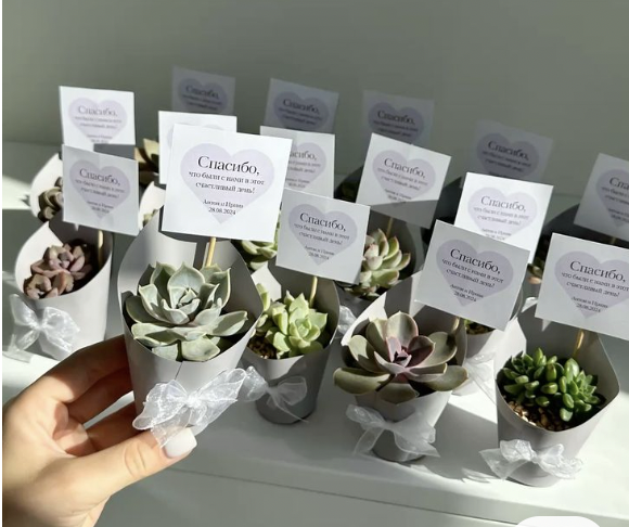Но я придумала для вас еще больше классных идей для запоминающегося подарка гостям на свадьбе! 1) Пустые фоторамки. Символично укажет на то, что их можно заполнить фотографией с вашей свадьбы. Можно так и подписать: "Для памятного фото с нашей свадьбы. Спасибо, что были с нами!" 2) Маленькие фотоальбомы. С тем же посылом, что и первый пункт. 3) Несколько фотографий каждого гостя (печатаем заранее, про это была статья - по ссылке). 4) Мини-растения — суккуленты в горшочках, будут долго напоминать про ваш день. 5) Смешные подарки. На своей свадьбе помимо брелков мы дарили призы за конкурсы, и многие из них были шуточные. Почти все купили в магазине Modi - это были разные мини