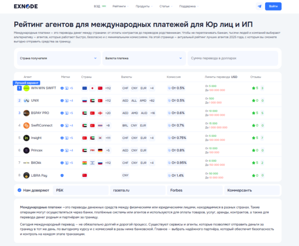 В условиях ограничений 2025 года операции с нерезидентским рублем требуют надежных посредников. На основе анализа платформы Exnode мы составили рейтинг лучших платежных агентов, учитывая скорость обработки транзакций, размер комиссий и отзывы клиентов.
