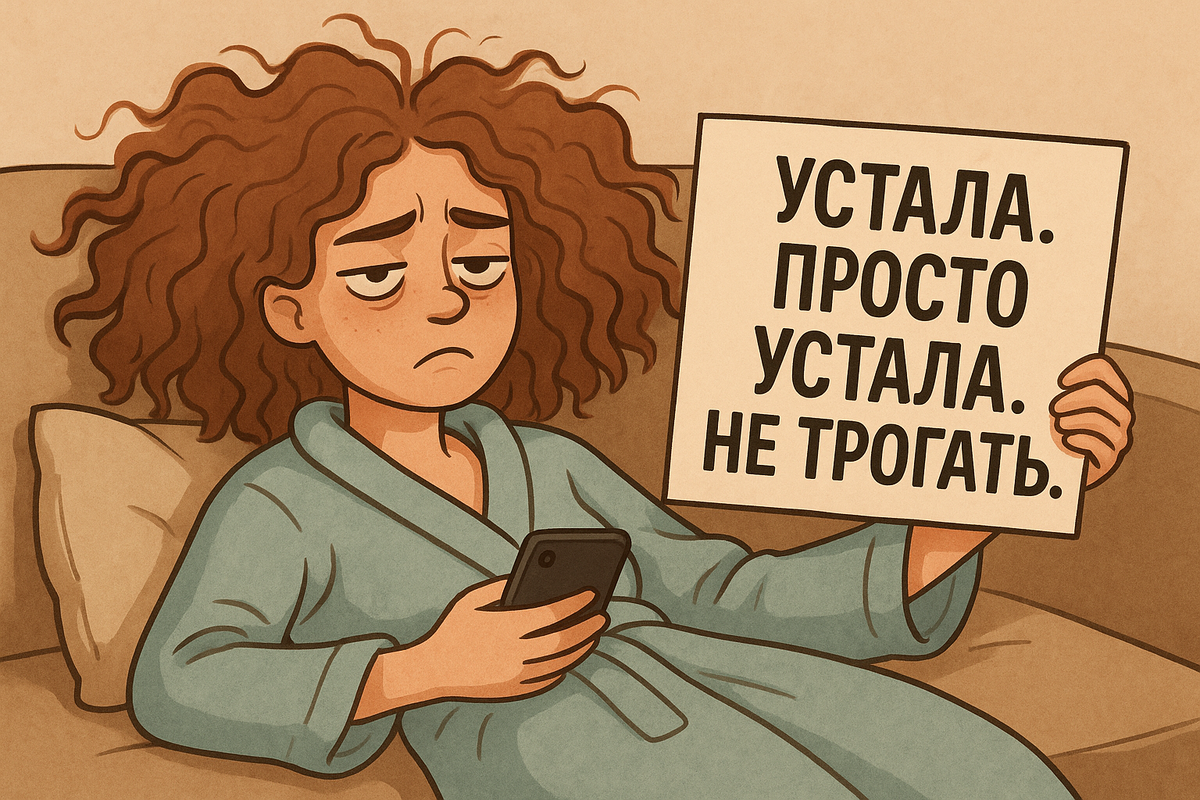 Ты лежишь на кровати, скроллишь ленту, у тебя жирная голова, и где-то рядом грустит немытая чашка из-под дошика. И вдруг кто-то говорит: — “Соберись уже! Просто лень.” Лень? Да я не ленивая. Я просто не могу. Я на 1% заряда. Даже зарядка не работает. 🧠 Мы устаём НЕ от дел. А от постоянного “надо” Никто не говорит, как утомляет: – быть на связи 24/7 – выглядеть “нормально”, даже когда ты развалина – делать “ещё чуть-чуть” каждый чёртов день И ты вроде ничего “тяжёлого” не делала — а по ощущениям будто строила мост через Сочи к Турции, одной лопатой и на кефире. 💣 Перегорание — не когда ты устала. А когда даже отдых бесит Ты садишься “передохнуть”, но: – не можешь расслабиться, потому что “дел много” – не можешь начать, потому что “сил нет” – и просто залипаешь в состояние: я грустный картофель Ты не лежишь — ты существуешь. И это уже огромная работа. 💌 Как понять, что ты перегорела, а не просто ленивая? Чеклист: ☑️ Ты хочешь плакать, но не знаешь почему ☑️ У тебя нет желан