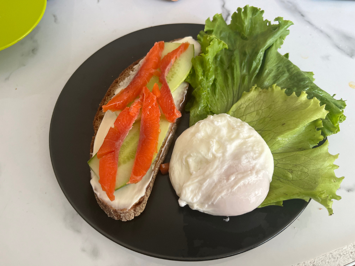 Утром позавтракали с детьми. Дети съели бутерброды с чаем, я - яйцо-пашот, бутерброд с красной рыбой и огурцом.