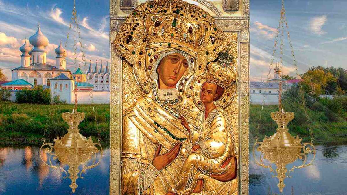 «Тихвинская» икона — звезда, сияющая у северных рубежей сохраняемой благодатью Божией земли Русской. Если в центральных землях — «Владимирская», на востоке — «Казанская», на юге — «Иверская», на западе — «Почаевская», то на севере сияет «Северная Царица» — «Тихвинская» икона Божией Матери. По преданию, «Тихвинская» икона Божией Матери — одна из икон, написанных святым апостолом и евангелистом Лукой. До V века она пребывала в Иерусалиме, затем образ перенесли в Константинополь, где для него был построен Влахернский храм. В 1383 году, за 70 лет до взятия турками Константинополя, икона исчезла из храма и была обретена в северных русских пределах. «Тихвинская» икона прославилась множеством чудес и исцелений. Царица Небесная, возлюбившая православную Русь, утверждает в ней истинную веру. Не раз в истории Богоматерь покровительствовала городам русским во время нашествия иноплеменников, помогала их защитникам отстоять рубежи. Так, Тихвинский Успенский монастырь оставил заметный след в истор