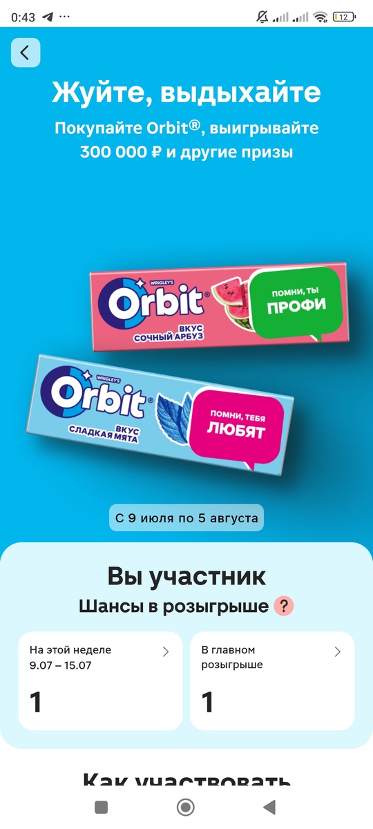 Привет любителям сохранить свои доходы и приумножить их 👋 Листала я тут разные акции и увидела возможность совместить некоторые покупки и поучаствовать с ними в разных активностях за раз. Делюсь и с вами. У Орбита сейчас проходит акция в Магните. Нужно обязательно нажать "участвую" в приложении, купить жвачку используя куар-код из приложения (пластиковая карта не подходит). Можно получить гарантированные 50 бонусов Магнита если попадешь в 10 000 первых участников, поучаствовать в розыгрыше. Баннер акции в приложении Призовой фонд Я ещё в ЧекСкане от ВКонтакте увидела, что у них можно отсканировать чек и получить кэшбэк до 45 руб, но это накопительная акция. Т е чем больше покупаешь, тем больше сумма (но и потратить ты должна, соответственно, больше). Если часто пользуешься жвачкой, то отличная возможность сэкономить и, возможно, выиграть. Я покупаю их редко и использую либо под настроение, либо на встречах, но больше предпочитаю мятную конфету, чем жвачку. 1 пачку купила, над 2 поду