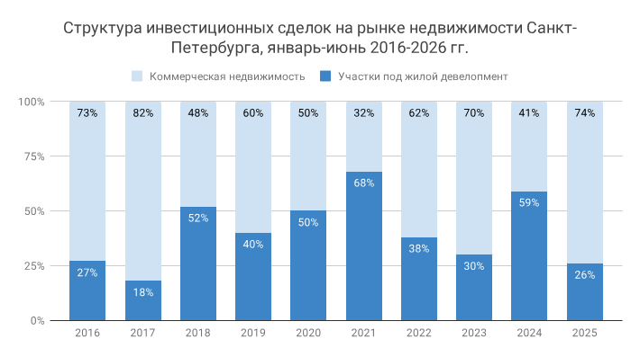 Инвесторы пересматривают стратегии развития: многие отказываются от приобретения участков для реализации новых жилых проектов. Доля вложений в земельные наделы сократилась с 59% до 26%. Объем вложений в участки под жилые проекты в Северной столице составил всего 10 млрд руб., что в 3 раза ниже значения за январь-июнь 2024 года и приблизилось к минимальному значению с 2017 года. Совокупный объем инвестиционных сделок с недвижимостью Санкт-Петербурга на середину июня 2025 года составил 38 млрд руб., подсчитали в консалтинговой компании IBC Real Estate. Это на 24% ниже результата за сопоставимый период предыдущего года. Сохранение жесткой денежно-кредитной политики продолжает оказывать влияние на настроения инвесторов. При этом если объекты коммерческой недвижимости продолжают пользоваться спросом, то вложения в сегмент жилого девелопмента значительно сократились: за период января-июня доля вложений в земельные участки под строительство жилых проектов в общем объеме вложений сократилась д