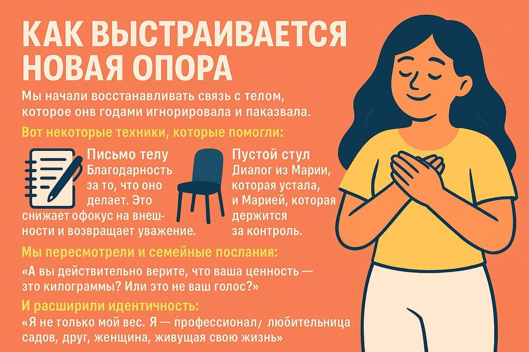 Мария, 42 года, бухгалтер. В профессиональной жизни — успешна, а вот в отношениях с собственным телом чувствует себя в ловушке. Её первый запрос звучал просто и пронзительно:«Я устала думать о еде и весе. Хочу просто жить, а не считать калории». Мария пришла ко мне с типичным для многих женщин опытом: десятки лет борьбы с весом, диетами, срывами и... чувством вины. Это не про лишние килограммы — это про внутреннюю войну с собой, про жизнь, где тело стало врагом, а еда — полем битвы. Что стоит за бесконечной диетой? За 20 лет у Марии сложился жесткий цикл: диета → срыв → вина → новая диета. Она жила по правилам, которым никто не может соответствовать вечно: «Сахар — яд», «После 18:00 есть нельзя», «Толстая — значит неудачница». Когда мы начали терапию, выяснилось, что за этими установками — голоса её семьи. Мать говорила: «Мужчины любят только худых». Отец комментировал фигуру уже с 12 лет: «Кто тебя такую возьмёт?» А бабушка приравнивала отказ от еды к отказу от любви. Мария жила не св