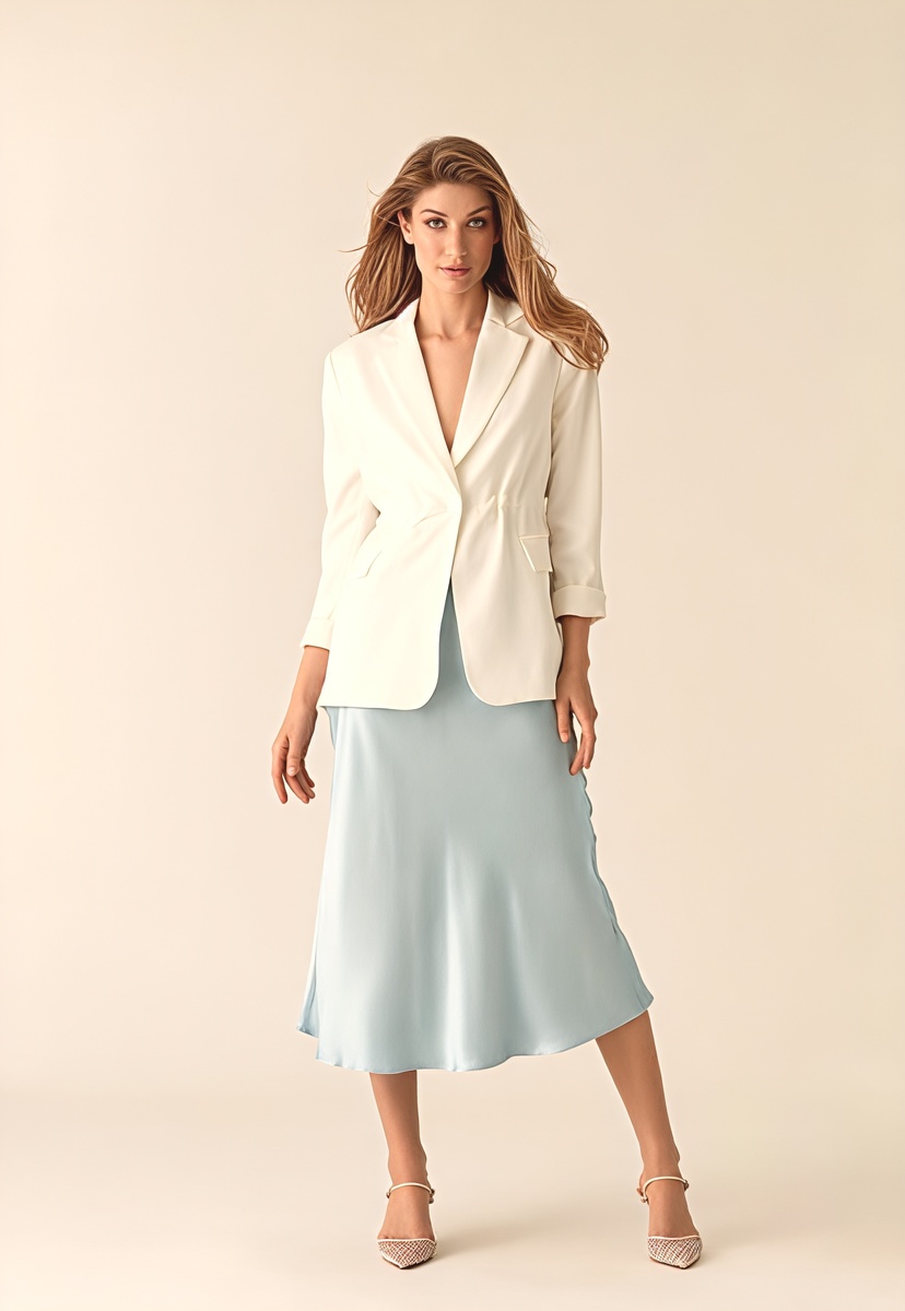 Удлиненный жакет в сине-фиолетовом оттенке с бежевой юбкой-миди. Шелковая блуза сливочного оттенка, туфли на умеренном каблуке. Профессионально, но не скучно.