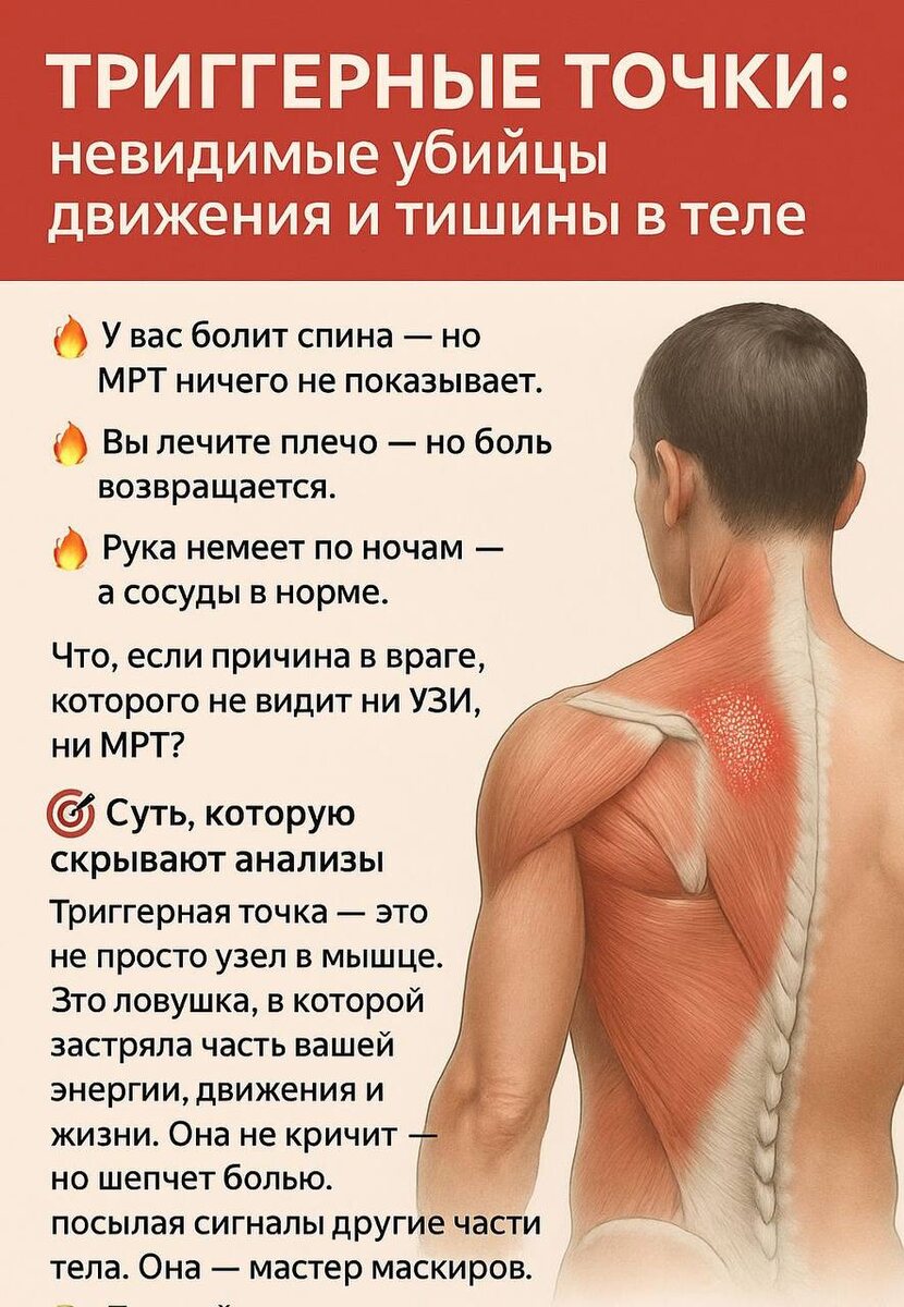 Триггерные точки: невидимые убийцы движения и тишины в теле > 🔥 У вас болит спина — но МРТ ничего не показывает. Вы лечите плечо — но боль возвращается. Рука немеет по ночам — а сосуды в норме. Что, если причина в враге, которого не видит ни УЗИ, ни МРТ? --- 🎯 Суть, которую скрывают анализы Триггерная точка — это не просто узел в мышце. Это ловушка, в которой застряла часть вашей энергии, движения и жизни. Она не кричит — но шепчет болью, посылая сигналы в другие части тела. Она — мастер маскировки. Под неё часто маскируются мигрень, радикулит, боли в сердце или желудке. > И пока вы ходите по врачам, она лишь сильнее сжимает мышцу — как удав. --- 🕳️ Как возникает этот невидимый узел? ТТ появляются там, где тело устало терпеть: Мышца, державшая спину в ночные смены — сдаёт. Шея, наклонённая к экрану 10 лет — сжимается. Живот, в котором годами копились эмоции — каменеет. И всё это — без видимой травмы. Начинается микроколлапс: нарушение кровотока, накопление молочной ки