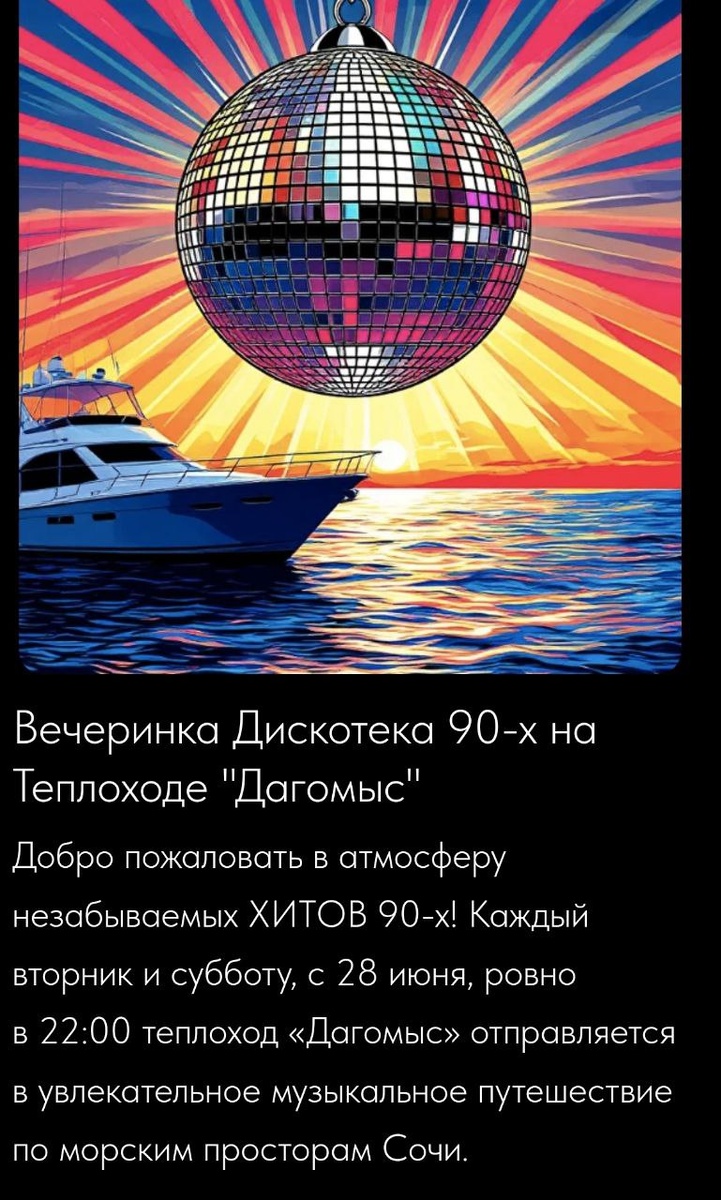 Приглашаем провести незабываемый вечер на теплоходе Дагомыс с популярной программой 🪩 РЕТРО - ВЕЧЕРИНКА В СТИЛЕ 90х❗ УЖЕ в эту субботу 12 ИЮЛЯ в 22:00 ⚠️ бронирование на 12 июля СО СКИДКОЙ 1000₽ от @ART_SOCHI⤵️ 89996554584 Теплоход "Дагомыс" отправляется ✔️с Морпорта Сочи! ✔️ рейс 90мин 💃🕺 На борту: 🪩 Любимые хиты 90-х 🪩 Живой DJ с оригинальными ремиксами 🪩 Световое шоу 🪩 Конкурсы, которые вернут вас в эпоху легендарных дискотек 🪩 Освежающие коктейли и закуски на любой вкус в баре на борту 🪩 Шикарные виды ночного Сочи с палубы 🪩 Незабываемая атмосфера веселья и ностальгии 🔴 Собирайте друзей, наденьте свои лучшие наряды в стиле 90-х и присоединяйтесь на вечеринку, о которой вы будете говорить весь год! 💥 Отправляемся в рейс через канал @ART_SOCHI СО СКИДКОЙ 👌🏻 💥 Количество мест ограничено! 🪩 Расписание рейсов дискотеки 90х на теплоходе по 13 сентября: Июль: 12, 15, 19, 22, 26, 29 Август: 2, 5, 9, 12, 16, 19, 23, 26, 30 Сентябрь: 2, 6, 9, 13 ⚠️ Бронирование открыто