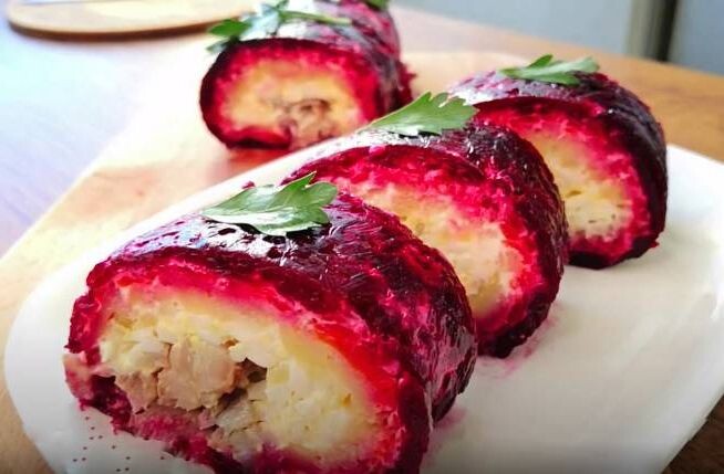 Сейчас покажу как классическую селедку под шубой приготовить более оригинальном способом, то есть свернем ее в рулет. Шуба в виде рулета очень удивит ваших гостей. Для приготовления такого необычного блюда нужны такие же ингредиенты как для классической «шубы», но также потребуется обычный желатин. С помощью желатина можно придать салату плотную форму рулета, что ломтики овощей и рыбки прекрасно будут смотреться в разрезе. Идеально для праздничного стола! Ингредиенты: Приготовление: 1. Отварите все овощи и яйца. Остудите, очистите от кожицы и натрите на крупной терке. 2. В миске желатин залейте холодной водой. Хорошо размешайте и оставьте для набухания на 10-15 минут. Добавление желатина в селедку под шубой рулетом не только придает ей более привлекательный внешний вид и лучшую текучесть. 3. После этого желатин перемешайте с тертой свеклой. Кстати, если свекла при натирании выделила много сока, то слейте его. 4. Возьмите пищевую пленку и сложите ее в несколько слоев. Смажьте ее растите