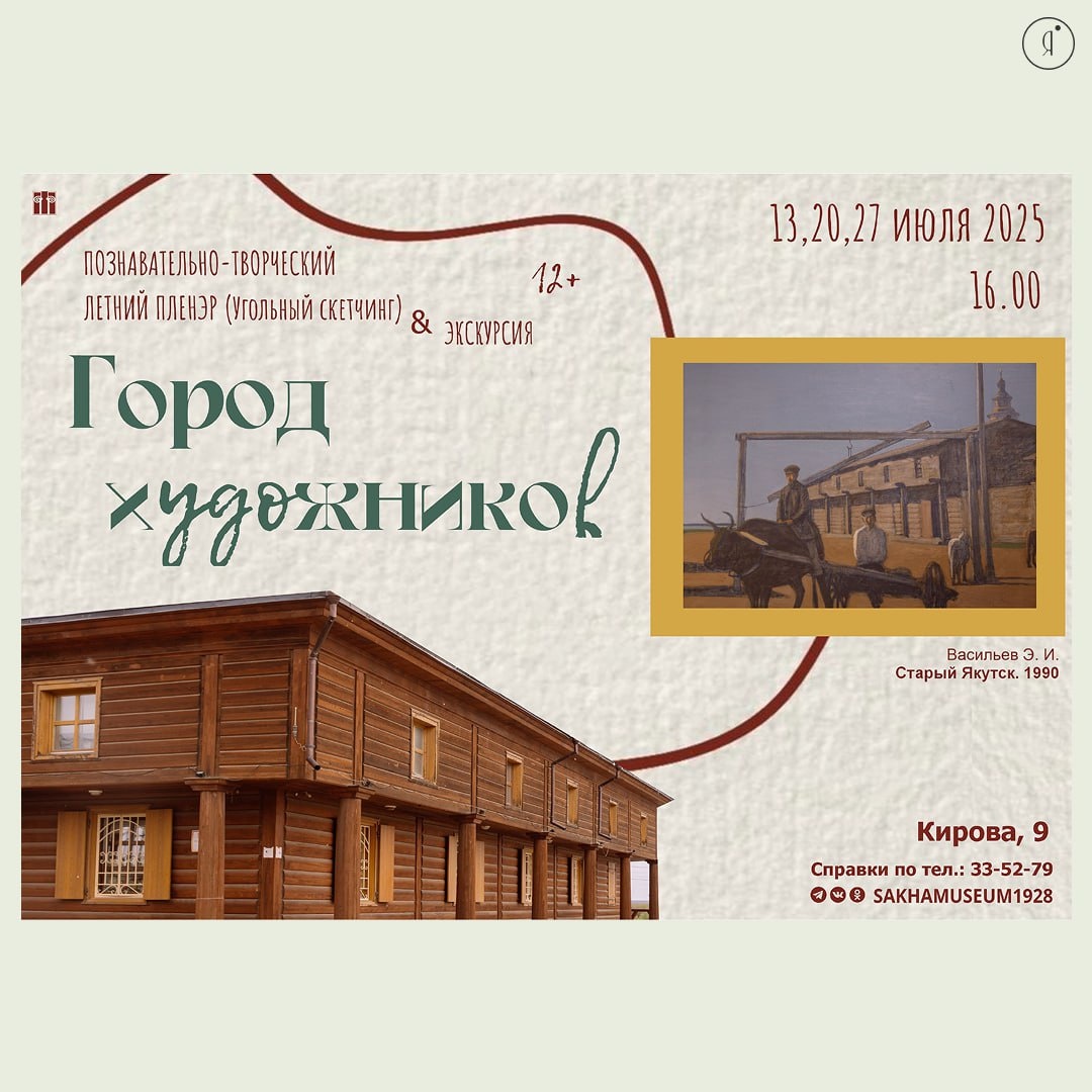 Летний пленэр «Город художников» 12+ #МК #ВГороде На открытом воздухе в самом центре Якутска под руководством художника вы сможете перенести на бумагу в технике угольного скетчинга известные архитектурные объекты в окружении летнего пейзажа. ➕ Экскурсия по выставке «Искусство Якутии» ➕ Прогулка от музея до памятника первопроходцам 🤩 С собой рекомендуем взять воду, антикомаринку и хорошее настроение! В группе – до 10 человек 13, 20, 27 июля | 16:00 НХМ РС (Я), Кирова, 9 -- Старый город 350-500 руб. Билеты Справки по номеру: +7 4112 335279 Online Якутия | Подписаться