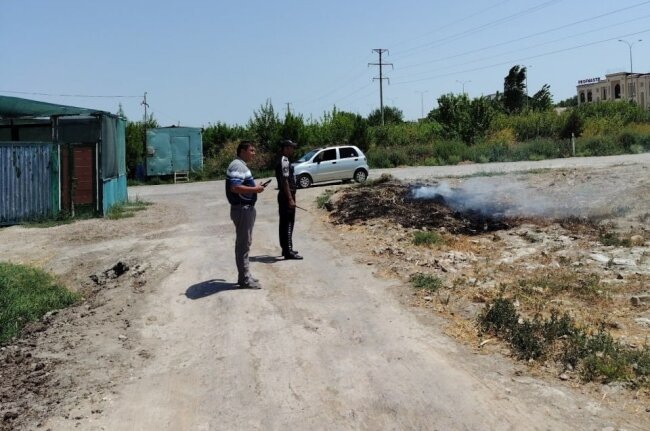 Инспекторами экологии была проведена проверка по факту распространившейся информации о сжигании мусора рядом с рестораном "Паризод" в городе Бухаре. прибыв на место инцидента инспекторы экологии установили, что сжиганием мусора на данной территории занимается житель ближайших домов.