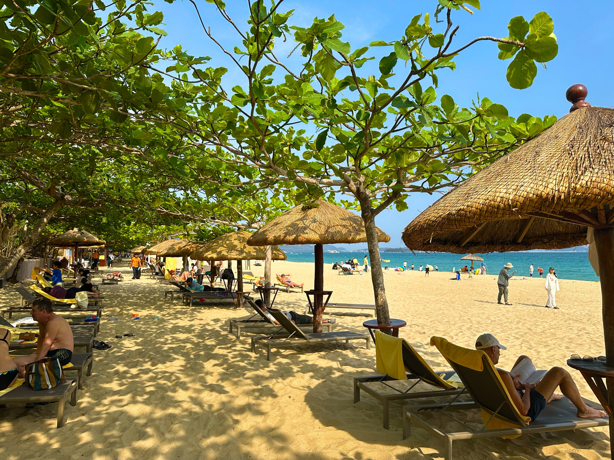 - Пляж: Пляж Санья Бэй очень длинный (около 22 км), но не считается самым живописным. Песок более крупный и темный, вода не такая прозрачная, как в других бухтах. Часто бывают волны. У берега может быть много лодок. Народу довольно много, особенно в выходные и праздники. Но опять же за счет протяженности в некоторых районах море абсолютно нормальное. Многие туристы жалуются на наличие песчаных блох, которые могут сильно покусать (кусают далеко не всех, активны не круглый год).