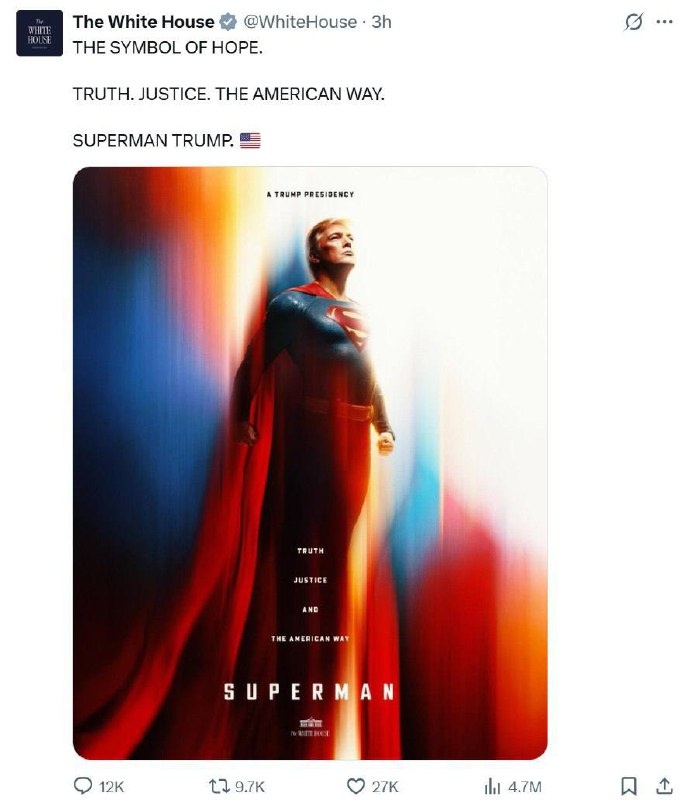 🤐 «Символ надежды, правды и справедливости. Американский путь. Трамп — Супермен», — говорится в сообщении.