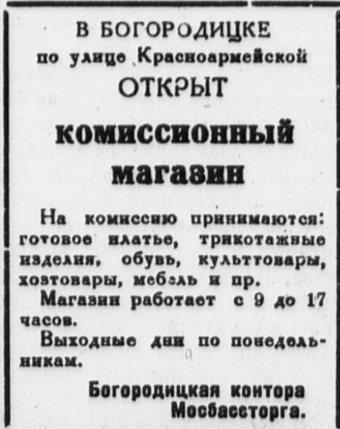 18 февраля в 1941 году в Богородицке по улице Красноврмейской (ул. Ленина, бывшая Екатериненская) Открыт комиссионный магазин. На комиссию принимаются готовое платье, трикатажные изделия, обувь, культтовары, хозтовары, мебель и пр.