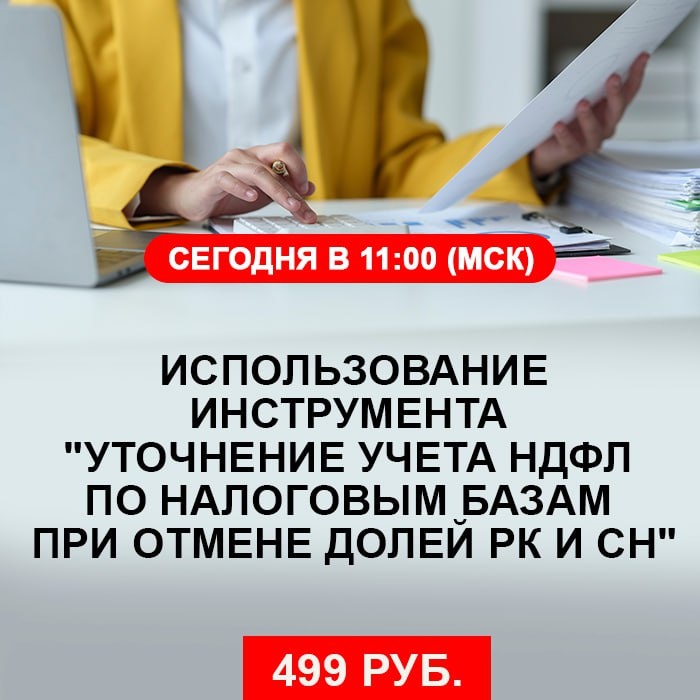 Не пропустите. Сегодня пройдет онлайн-обучение "Использование инструмента "Уточнение учета НДФЛ по налоговым базам при отмене долей РК и СН" — https://uc1.1c.ru/course/ispolzovanie-instrumenta-utochnenie-ucheta-ndfl-po-nalogovym-bazam-pri-otmene-dolej-rk-i-sn/. Всего 499 рублей. Обучение ведет Алла Назарова — практикующий консультант со стажем более 15 лет, преподаватель популярных курсов для бухгалтеров, методолог на крупных проектах по внедрению ЗУП, спикер 1С:Лектория.