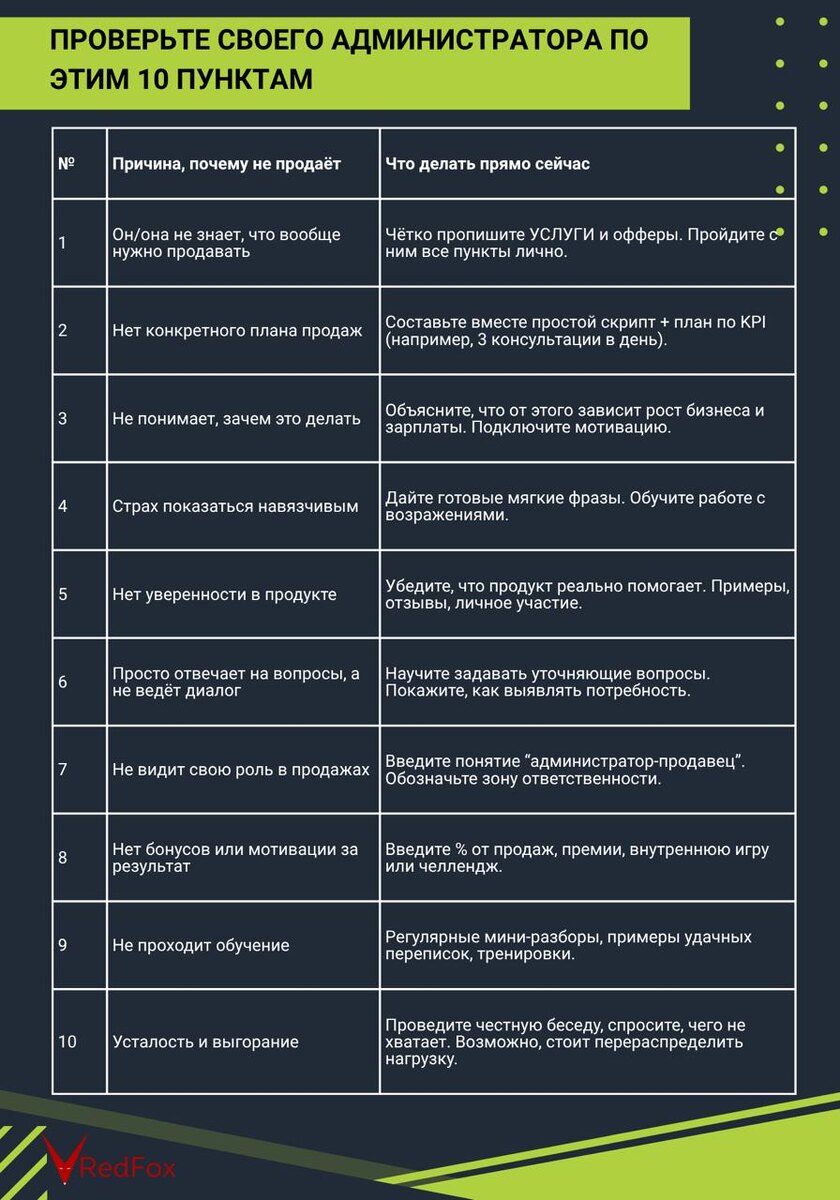π10 ΠΏΡΠΈΡΠΈΠ½, ΠΏΠΎΡΠ΅ΠΌΡ Π°Π΄ΠΌΠΈΠ½ΠΈΡΡΡΠ°ΡΠΎΡ Π½Π΅ ΠΏΡΠΎΠ΄Π°ΡΡ β ΠΈ ΠΊΠ°ΠΊ ΡΡΠΎ ΠΈΡΠΏΡΠ°Π²ΠΈΡΡ ΠΡΠΎΡ ΡΠ΅ΠΊ-Π»ΠΈΡΡ ΠΏΠΎΠΌΠΎΠΆΠ΅Ρ ΠΏΡΠ΅Π΄ΠΏΡΠΈΠ½ΠΈΠΌΠ°ΡΠ΅Π»ΡΠΌ, Π²Π»Π°Π΄Π΅Π»ΡΡΠ°ΠΌ ΡΠ°Π»ΠΎΠ½ΠΎΠ², ΡΡΡΠ΄ΠΈΠΉ, ΠΊΠ°Π±ΠΈΠ½Π΅ΡΠΎΠ² ΠΈ ΡΠ΅Π½ΡΡΠΎΠ² ΡΠ°Π·ΠΎΠ±ΡΠ°ΡΡΡΡ, ΠΏΠΎΡΠ΅ΠΌΡ Π°Π΄ΠΌΠΈΠ½ΠΈΡΡΡΠ°ΡΠΎΡ βΡΠΈΠ΄ΠΈΡ Π½Π° Π·Π°ΡΠΏΠ»Π°ΡΠ΅β, Π½ΠΎ Π½Π΅ ΠΏΡΠΎΠ΄Π°ΡΡ, ΠΈ ΡΡΠΎ Ρ ΡΡΠΈΠΌ Π΄Π΅Π»Π°ΡΡ. ΠΡΠΎΠ²Π΅ΡΡΡΠ΅, ΠΊΠ°ΠΊΠΈΠ΅ ΠΎΡΠΈΠ±ΠΊΠΈ Π΅ΡΡΡ Ρ Π²Π°Ρ β ΠΈ ΠΏΠΎΠ»ΡΡΠΈΡΠ΅ ΠΏΡΠΎΡΡΡΠ΅ ΡΠ΅ΡΠ΅Π½ΠΈΡ Π΄Π»Ρ ΠΊΠ°ΠΆΠ΄ΠΎΠΉ. π― Π§ΡΠΎ Π΄Π΅Π»Π°ΡΡ Π΄Π°Π»ΡΡΠ΅: β