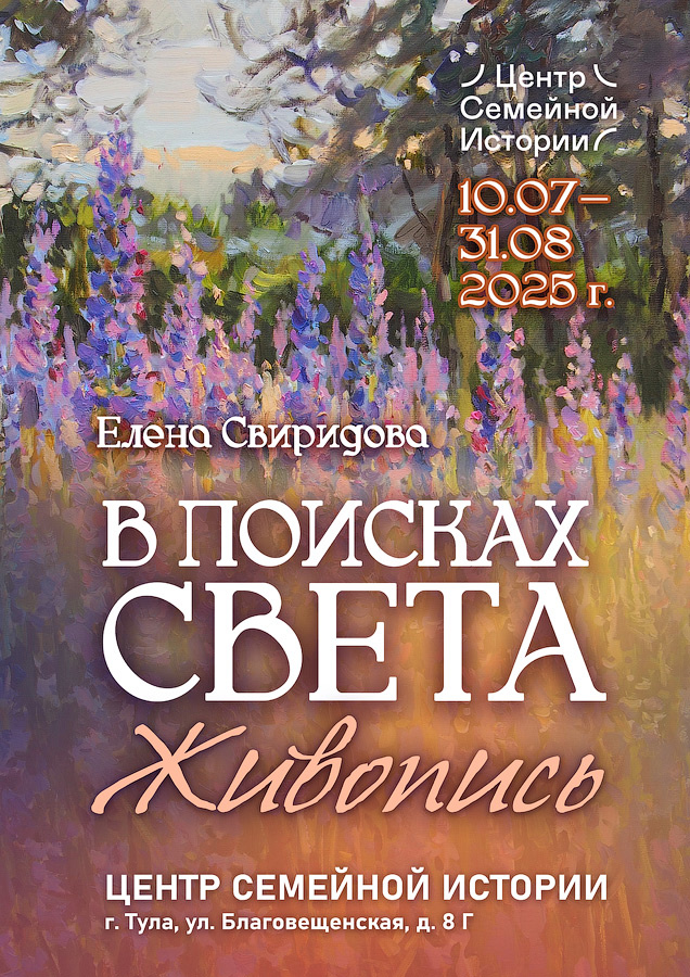 13 июля 2025 года в 15:00 в Центре семейной истории (г.Тула, ул.Благовещенская, д.8Г) состоится открытие выставки живописи Елены Свиридовой «В поисках света». Наверное, это и есть ответ на вопрос: для чего художник пишет картины. Что влечёт снова и снова браться за кисти и пускаться в погоню за мимолётным светом, пронизывающим всё вокруг. Потому что свет этот делает каждое мгновение особенным, шепчет нам что-то, и будто бы что-то обещает… Расшифровать эти послания не представляется возможным. Но и не стремиться навстречу этому призыву не выходит. Потому что брезжит что-то на самом краешке красоты. На краешке заката, который сулит феерией красок что-то невозможно прекрасное — но всё равно гаснет. А свет, который бередил душу, остаётся. Его просто не может не быть — не показываемого нам до поры, манящего, волшебного света, касающегося мимолётным крылом закатных облаков. И цветов, хрупких и прекрасных, будто прямиком из заоблачных миров. И чарующего кружева света и тени, словно зовущего к