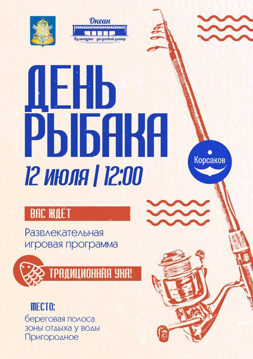 День рыбака в Корсаковском районе – ждём всех! 😘Приглашаем жителей и гостей округа на яркий праздник, посвящённый Дню рыбака! 🗓12 июля в 12:00 часов 📍береговая зона отдыха у воды, пос. Пригородное Вас ждёт: ▪️Ароматная уха, ▪️Увлекательные развлечения для всей семьи, ▪️Море позитива и отличного настроения. ☀️Не упустите возможность провести этот день у воды в кругу друзей и близких! До встречи на празднике! @kdzokean
