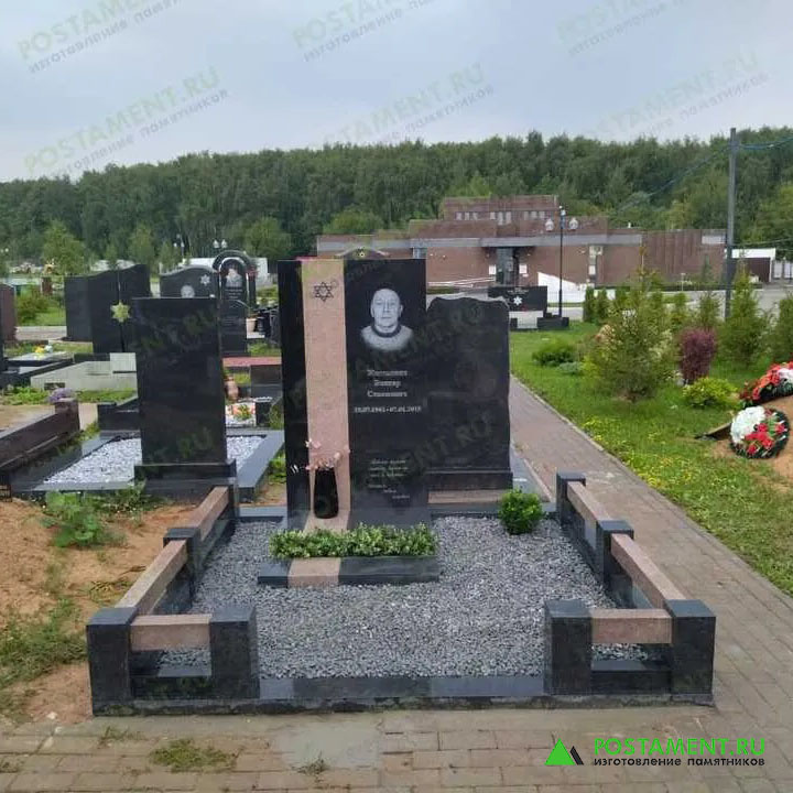 Мемориальный комплекс, словно сотканный из контрастов, представлен в траурной торжественности черного Габбро-Диабаза, пронизанного светлой тропинкой из Куртинского гранита. Полтора месяца кропотливого труда вдохнули жизнь в этот монумент скорби, нашедший свой приют на Востряковском кладбище. Куртинский гранит, словно нежный луч света в темном царстве камня, деликатно подчеркивает надгробие тонкой декоративной полосой, а его бруски, подобно стражам, обрамляют каменную оградку. Лик усопшего, запечатленный в вечности, метрические данные и эпитафия, выполненные с филигранной точностью лазерным гравером пятого поколения, рассказывают историю жизни, оборванной безжалостной судьбой. На светлом гранитном ложе, подобно звезде надежды, сияет накладной знак из бронзы – Звезда Давида, символ веры и вечной памяти. Под покровом геотекстиля, на подушке из песка, усыпанной щебнем, покоится земля, взрастившая многолетние растения, что своими нежными ростками тянутся к небесам, словно мольба об упокоени