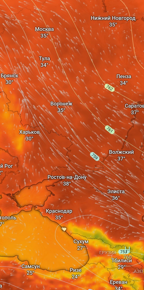 🌡️Экстремальная жара установилась на европейской территории России, в Беларуси и Украине. Столбик термометра на датчике в центре Москвы поднялся до +35,4°C. В южных регионах России вчера днём воздух прогрелся до +38..+40 градусов Цельсия. Сегодня ожидается очередной раунд жаркой погоды. 🏖 Погода Лазаревское