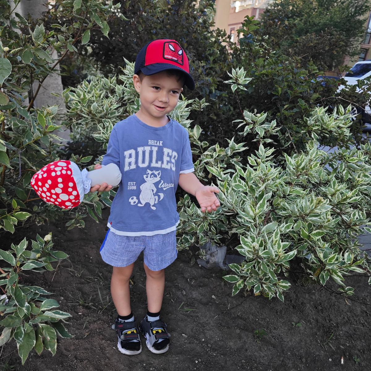 Казалось бы, что тут особенного, гриб и гриб, но это же мухомор! Он яркий, красивый , притягивает взгляд, потому что красный , да ещё в горошек. Шьют эти замечательные грибы чаще для декора и в виде броши или обвеса для сумки. Маленький внучок Лёша увидев этот гриб, захотел его сшить сам. Я ему , конечно , помогла осуществить эту задумку . Гуляет с ним и спит тоже. Ещё я использую мухомор в развивающих играх, например для моторики, меткости (кидаем в корзинку), для развития речи ( 🍄 - рифмоплёт): - скажи "муха" - муха - вот твоё ухо! - скажи "паровоз" - паровоз - вот твой нос! - скажи "бегемотик" - бегемотик - вот твой животик! - скажи "тазик" - тазик - вот твой глазик! Выкройка простая Дублируем ткань флизелином, чтобы при набивке избежать целлюлита . Обводим шаблон Вырезаем одну деталь шляпки с припуском 1 см, а остальные две избытком. Стачиваем все три детали по линии, после этого вырезаем остальные детали по первой. Лёше 4 года 4 месяца, с компьютеризированной швейной маши