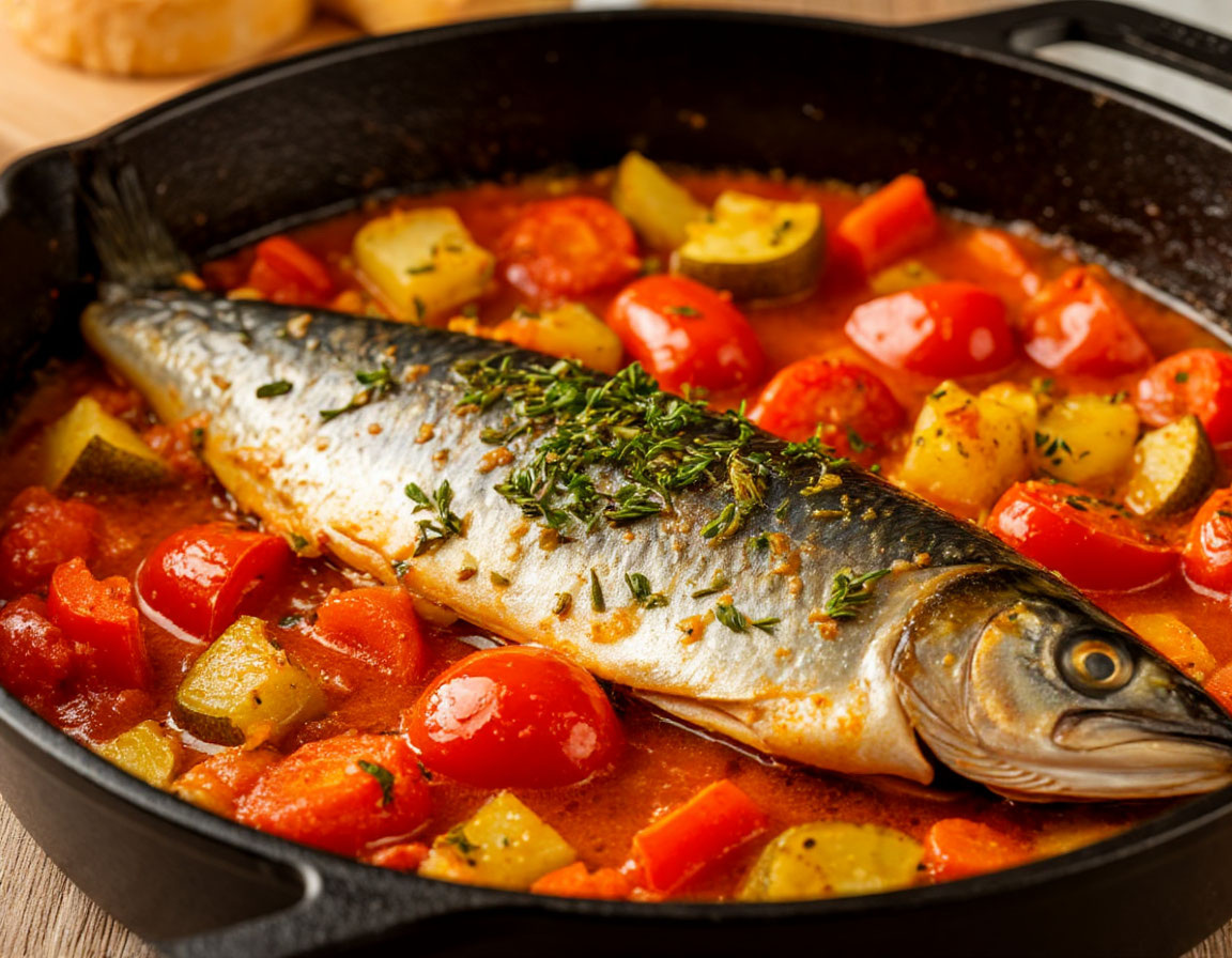 - Достаньте овощи, выложите сверху скумбрию и верните в духовку ещё на 20–25 минут.