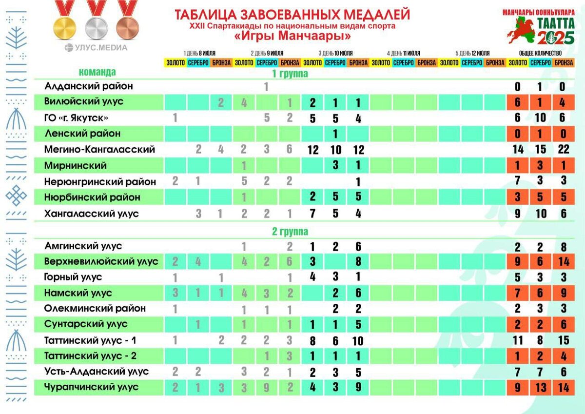🥇 Таблица завоеванных медалей XXII Спартакиады по национальным видам спорта «Игры Манчаары» за 10 июля — смотрите, кто лидирует