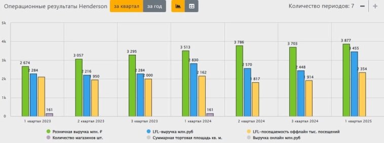 💪 Несмотря на замедление в экономике, Хендерсон продолжает штамповать отличные результаты месяц за месяцем. Так, по итогам января-мая выручка выросла на 18,8% г/г, а в мае даже ускорилась (+24,1%). 📱 Важным фактором роста продолжает оставаться онлайн-сегмент, который за 5 месяцев 2025 прибавил 41,2% по выручке год к году. 🤔 Но так ли все радужно на самом деле? Если копнуть поглубже, то всплывают некоторые нюансы. ✔️ Правда в том, что сопоставимые LFL-продажи оффлайн-салонов по итогу 4 месяцев 2025 растут всего на 3,4%. И то, только за счет инфляции. Посещаемость падает на 7,6%! Это значит, что выручка увеличивается только за счет открытия новых магазинов и успехов онлайн-сегмента, который приносит уже почти четверть доходов! 🕗 Вернемся чуть назад во времени. Я напомню, что еще по итогам 2024 года LFL-продажи росли двузначными темпами (+12,9% г/г). А в 1 квартале посещаемость сокращалась на 6,9%. А это значит, что экономическая ситуация не обходит стороной и Хендерсон, где уже начал