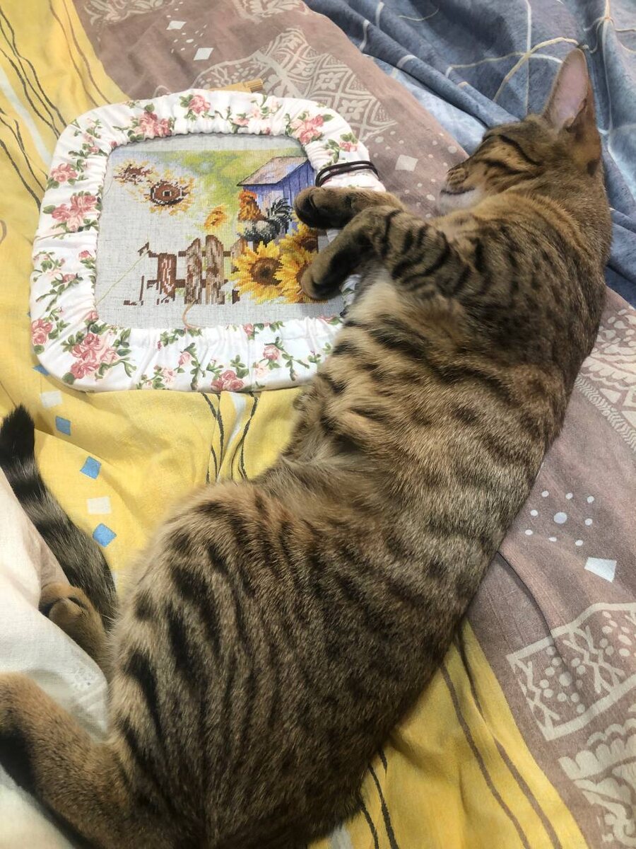 Соскучились? Я очень ❤️ Полпути пройдено, ещё пара недель и можно будет выдохнуть 😮💨 Утром и вечером я конечно вышиваю. Меньше чем обычно, но в удовольствие. Помогатор всегда рядом. И утром и поздним вечером Размеры помогатора можете оценить по лежащим рядом нурге 3