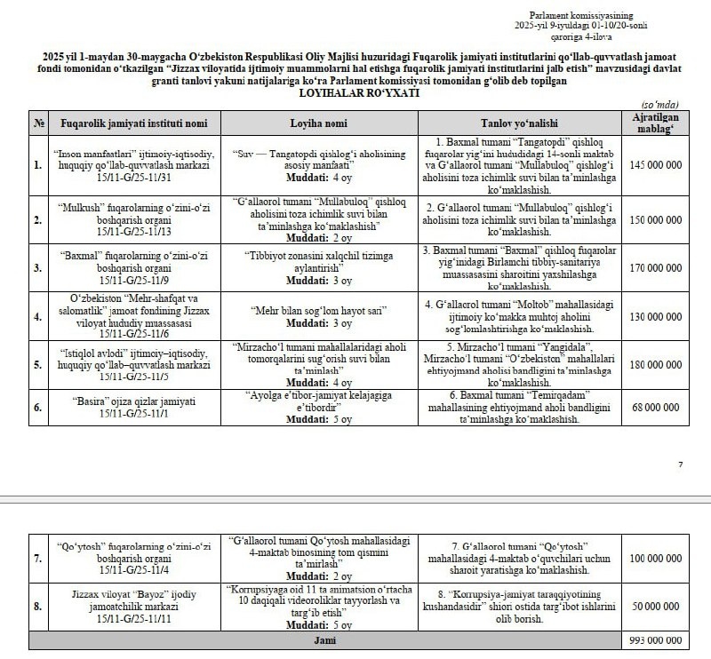Йилнинг илк грант танлови ғолиблари аниқланди Олий Мажлис ҳузуридаги Жамоат фонди томонидан аҳоли бандлигини таъминлаш, ижтимоий муҳофаза ва соғлиқни сақлаш, атроф-муҳит ва санитар-гигиеник ҳолатни яхшилаш, таълим, маданият ва спортни ривожлантириш, соғлом турмуш тарзини қарор топтириш, коррупцияга қарши курашиш каби йўналишларда эълон қилинган давлат гранти танлови ғолиблари аниқланди. Маълумот учун, Олий Мажлис ҳузуридаги Жамоат фонди томонидан эълон қилинган 14 та грант танловига 521 та, Жамоат фондининг ҳудудий бўлинмалари томонидан эълон қилинган 14 та грант танловига 329 та ариза келиб тушган. Парламент комиссияси томонидан 172 та лойиҳа ғолиб деб топилди. “Жиззах вилоятида ижтимоий муаммоларни ҳал этишга фуқаролик жамияти институтларини жалб этиш” танловига 8 та йўналишда лойиҳалар қабул қилинди. Танлов илк маротаба махсус платформа орқали, шаффоф ҳолда ўтказилди. Каналимизга обуна бўлинг ва энг сўнгги янгиликларни кузатиб боринг Jizzaxnews |Тelegram | Facebook | Dzen | Yo