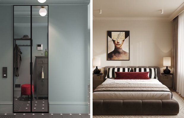 Их можете повторить и вы! Даже в стандартной планировке можно создать интерьер с характером. Этот проект — удачный пример: дизайнер Илона Рафикова оформила квартиру для молодой айтишницы, влюбленной в моду и комфорт. Пространство получилось запоминающимся и продуманным: ни один метр не пропал зря, а визуальная выразительность сочетается с функциональностью. Собрали пять приемов, которые пригодятся, если вы тоже планируете ремонт в типовой квартире. В типовых двушках часто встречается тесный санузел, где сложно разместить технику. Здесь ванную и туалет объединили и немного расширили за счет коридора. Благодаря приему появилось место для ниши со стиральной и сушильной машинами, а также вместительного технического шкафа над инсталляцией. Вместо классической бежево-серой палитры в прихожей выбрали нежный голубой оттенок. Он задает тон с первых шагов и гармонирует с яркими акцентами в остальных комнатах. Два зеркальных шкафа решают вопрос хранения, а яркая обувница завершает дизайн и вносит