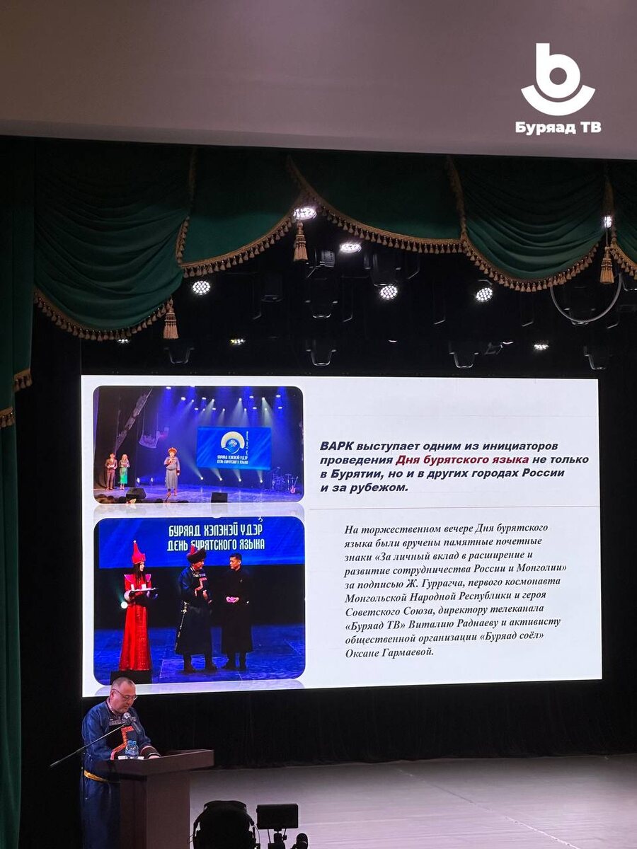 В Улан-Удэ состоялся внеочередной съезд межрегиональной общественной организации «Всебурятская ассоциация развития культуры» (МОД «ВАРК»). В ходе заседания с отчетом выступил президент ВАРК Чимит Бальжинимаев, а также собравшиеся члены обсудили изменения в уставе организации. В работе съезда принял член Общественной палаты Республики Бурятия, руководитель телеканала «Буряад ТВ» Виталий Раднаев. Виталий Раднаев отметил: «В 2024 году и в текущем году под эгидой «Всебурятской ассоциации развития культуры» состоялось более десяти различных культурно-просветительских мероприятий, в том числе нам удалось реализовать несколько новых телепроектов. Ассоциация также организовала выездные экспедиции на фестивали «Алтаргана-2024» и «Ёрдынские игры-2025». Что касаеться планов, то рассчитываем на дальнейшее плодотворное сотрудничество». Отметим, что одним из ярких примеров сотрудничества Буряад ТВ и ВАРК стало совместное шоу "ҮЗЭсХЭЛЭНтэ БУРЯАД", которое вызвало большой отклик среди зрителей. Шоу, н