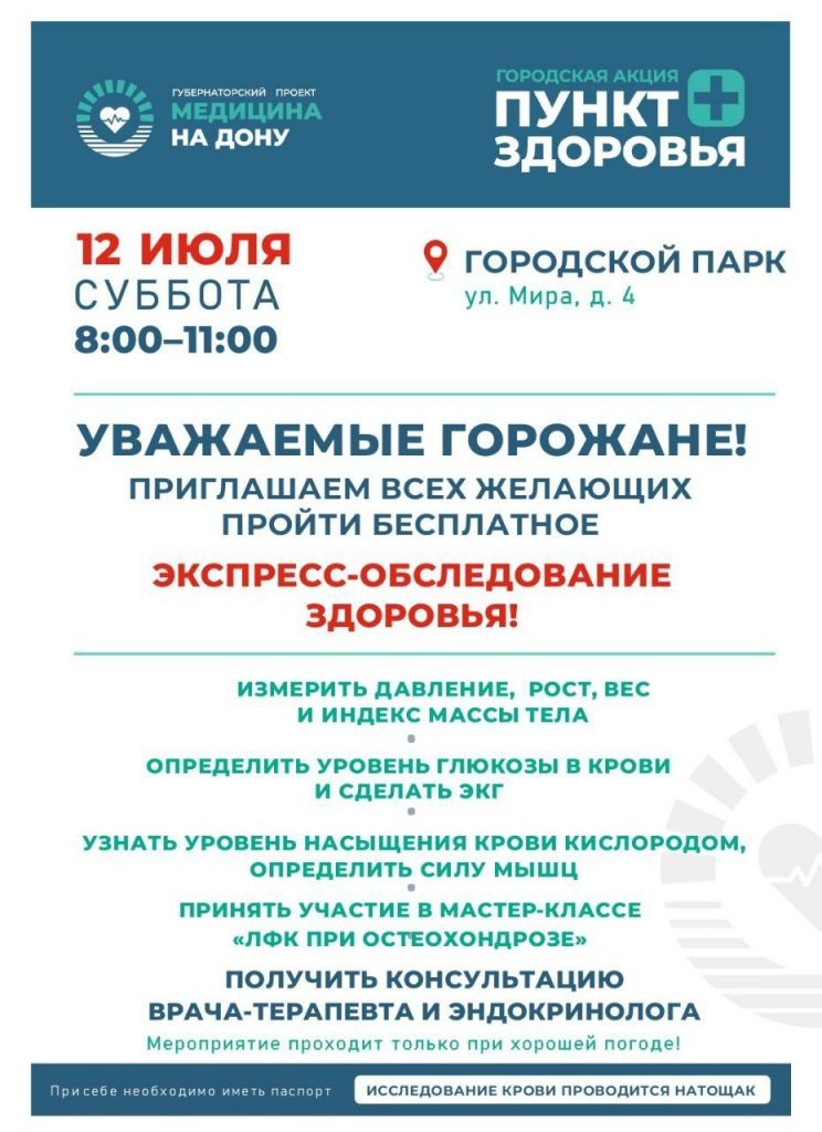 В эту субботу в Азове состоится очередной этап популярной медицинской акции «Пункт здоровья». Проект, инициированный губернатором Ростовской области Юрием Слюсарем, реализуется в рамках программы «Медицина на Дону» и направлен на заботу о здоровье жителей региона. В Городском парке «Жемчужина Азова» участников ждет бесплатная диагностика: измерение давления, роста, веса, расчёт ИМТ, а также анализ крови и ЭКГ. Можно будет получить консультации терапевта и эндокринолога. При себе необходимо иметь паспорт. Кровь сдаётся строго натощак. Из-за аномальной жары акция пройдёт с 8:00 до 11:00 – позаботьтесь о своём комфорте! Не упустите возможность проверить здоровье быстро и бесплатно!