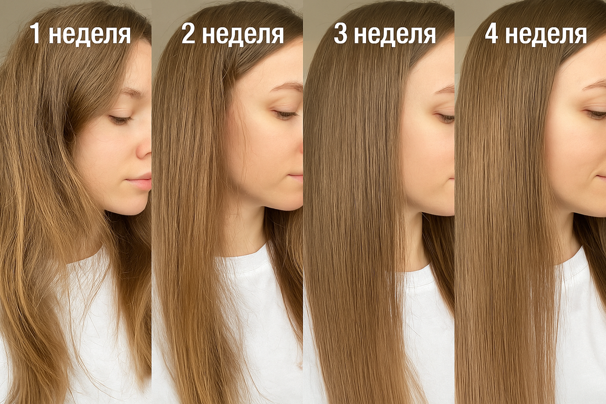 Волосы сразу после первого применения стали более послушными, появилось лёгкое ощущение плотности у корней. Отдельно отмечается текстура средств: шампунь даёт воздушную пену и легко смывается, не оставляя ощущения сухости, бальзам распределяется равномерно, не утяжеляет, не склеивает длину. После высушивания волосы мягче и визуально более гладкие. 2 неделя.