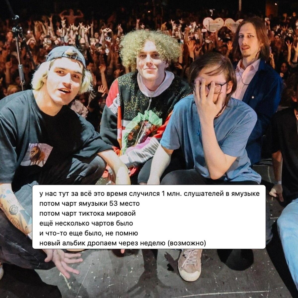 ПОЛМАТЕРИ выпустит новый альбом уже на следующей неделе? 🔥 Коллектив сообщил о своих последних успехах: 1 млн. слушателей в месяц в Яндекс.Музыки, чарт Яндекс.Музыки у «кхм-кхм», мировой чарт TikTok с тем же треком — ещё несколько других чартов и т.п. И группа решила порадовать альбомом «простая замечательная жизнь ипи», который выйдет на площадках в следующую пятницу — 18 июля. @mainstreamusic