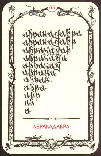 Абракадабра это карта колоды, означает ошибки, путаница в мыслях, ложь, отсутствие последовательности. Это карта, которая представляет собой довольно сложный и многогранный образ. Обычно она ассоциируется с процессом, в котором некоторые элементы исчезают. В контексте событий она может символизировать трудности, путаницу, неясные знаки и символы. Она во многом напоминает аркан «4 ветра», но в отличие от него эффект от этой карты длится дольше и постепенно исчезает. В то время как ветры просто рассеиваются, не оставляя после себя никаких следов. Карта указывает на человека, который силён и скрытен. Он предпочитает действовать в одиночку, не делится своими планами и упорно идёт к своей цели. Один из участников диалога не может постичь другого, он для него словно тайна. В перспективе — чувства могут исчезнуть, отношения могут сойти на нет. Всё дело в расчёте. Когда мы спрашиваем о чувствах к нам, человек становится загадочным и непонятным, но именно это делает его привлекательным, как та