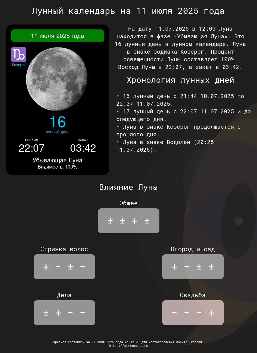Лунные календари на 11 июля 2025 года: Подготовьтесь к этому дню с учетом влияния Луны! 🔹🌗 Лунный календарь на 11 июля 2025 года — Что приготовила Луна? Подробнее 🔹✂️ Лунный календарь стрижек на 11 июля 2025 года — Подходящий ли день для обновления прически? Подробнее 🔹🌱 Лунный календарь огородника и садовода на 11 июля 2025 года — Лучшее время для ухода за растениями. Подробнее 🔹📅 Лунный календарь дел на 11 июля 2025 года — Удачные моменты для важных задач. Подробнее 🔹💍 Лунный календарь свадеб на 11 июля 2025 года — Подходит ли этот день для вашего торжества? Подробнее