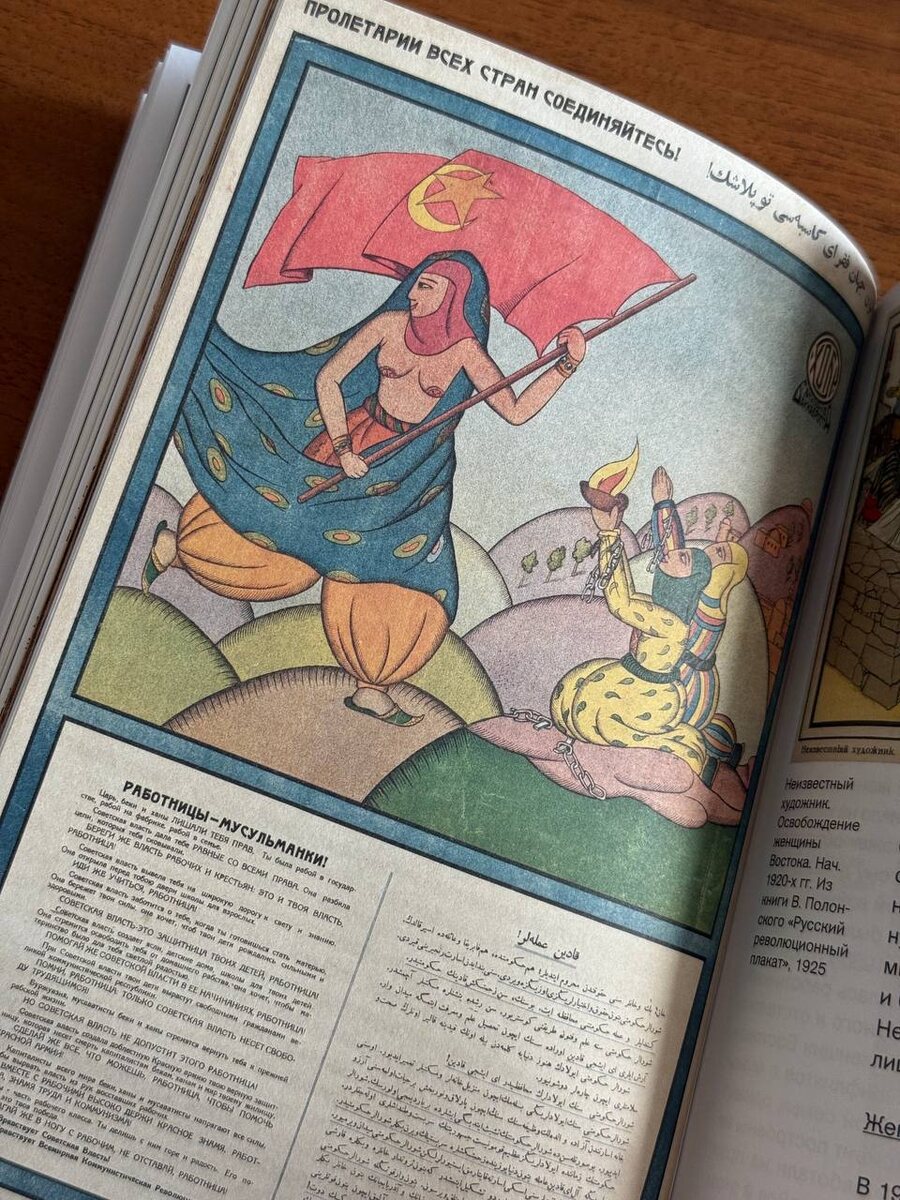 «Освобожденная женщина Востока» должна была стать эмблемой советской эмансипации 📍Один из примеров агитации, адресованный женщинам советского Востока, представлял из себя прозаичный призыв шагать в ногу со временем: учиться в школе для взрослых, создавать ясли, помогать Красной армии. Начинался этот призыв со слов: «Работница-мусульманка! Царь, беки и ханы лишали тебя прав. Ты была рабой в государстве, рабой на фабрике, рабой в семье….» 📍Но рисунок, мягко говоря, не совсем соответствовал этому призыву: «работница», подняв красный флаг со звездой и полумесяцем, шествовала в удивительном костюме - обнаженная до пояса, в рыжих шароварах и зеленых туфлях с золотой каймой, в красной хиджабе и развевающейся позади уже ненужной чадре. 📍Женщина, преступившая традиции, была главной героиней советской модернизации 1920-1930-х годов. Крестьянка вступала в колхоз или становилась работницей, освобождаясь от тесного, антисанитарного и отсталого патриархального быта. 📍Эмансипация «женщин Вост