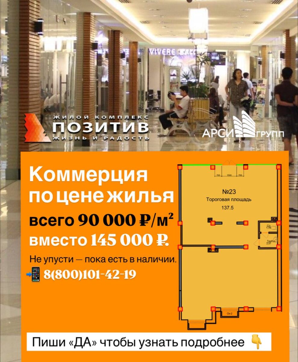 🏢 Коммерческое помещение 137,5 м² — по цене жилья! 😍 Смотрите, какая 🔥 планировка: — Пространство 137,5 м² — Удобная форма для зонирования — Отдельный вход — Витринные окна — Отлично подойдёт под салон, офис, шоурум, медцентр или мини-маркет 📍ЖК «Позитив» — динамичный жилой район с плотной застройкой и отличным автомобильным трафиком. Парковка рядом. Видимость с дороги. Особые условия только сейчас: ✅ Сниженная цена. 🔥 Вместо 145 000 ₽/м² — всего 90 000 ₽/м² Экономия — более 7 млн рублей‼️ ✅ Рассрочка 💬 Есть и другие площади участвующие в акции в этом комплексе — подберём под ваш запрос. 📞 Звоните по номеру: 8(800)101-42-19 Покажем, расскажем,забронируем.