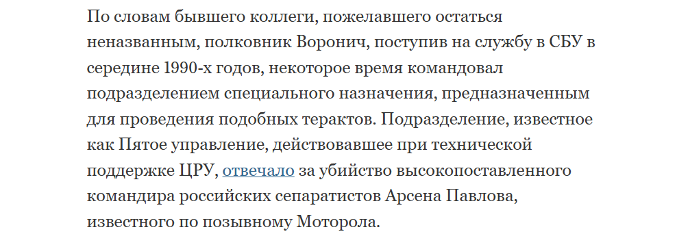 Об этом пишет американское издание "Нью-Йорк Таймс". Докладываю тезисы и личные соображения. Во-первых, товарищи, должен исправить неточность, допущенную мной во вчерашней статье "Кто застрелил Ивана Воронича". Там я написал, что полковник служил в группе "Альфа" ЦСО СБУ с 2014 года. Не правильно понял контекст. Оказывается Воронич служил в ЦСО десятилетиями (с середины 90-х годов прошлого века), а с 2014 года активно противодействовал России. По сведениям "Нью-Йорк Таймс", полученным от анонимного источника, полковник Воронич некоторое время командовал спецподразделением, известным, как Пятое управление СБУ. Вот цитата, в которой указана одна из операций Пятого управления. Прошу обратить внимание на роль ЦРУ: Действительно Пятое управление СБУ было создано в 2015 году. Основная задача - проведение спецопераций (диверсий и террористических актов на территории иностранных государств). Помимо убийства командира батальона "Спарта", совершенного в лифте многоэтажного дома в Донецке ос
