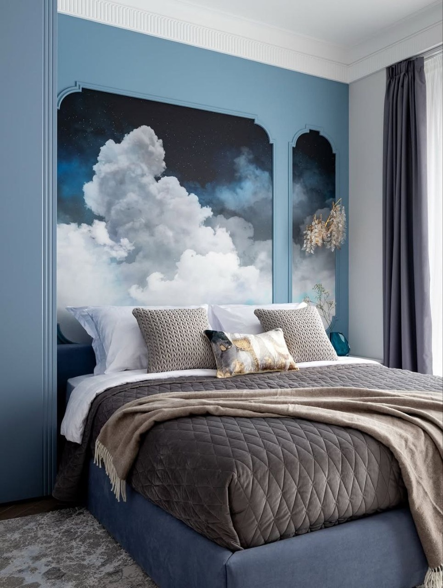 Жить и наслаждаться! ✨ Каталог обои #FineArt@affrescoru (арт. RE893-COL1) "Готовый проект в ЖК Энитео — уютная спальня, которая наполняет спокойствием и гармонией. Интерьер в серо-синих тонах — оттенки, которые прекрасно расслабляют и создают умиротворяющую атмосферу. ☁️Мы решили усилить эффект, добавив за изголовьем кровати изображение небес — так место стало еще более просторным и волшебным."- Дизайн студия Svoi_design - Посмотреть фрески, панно, обои и ткани можно в нашем интернет магазине. 📞 8-800-555-31-51 📨 Salon@affresco.ru 🌏 affresco.ru ⏰ Срок изготовления от 5 раб дней 🚀 https://vk.com/affrescoru ✈️ https://dzen.ru/id/5f710c51fe660a4af44007cb - #affrescoru #affresco #аффреско #фрески #обои #фотообои #обоидлястен #дизайнинтерьера #wallpaper #mural #фрескиназаказ #affrescoruвинтерьере #wallart #muralart #designinterior #настенныеобои #wallmural #интерьер #спальня #уют #дизайн