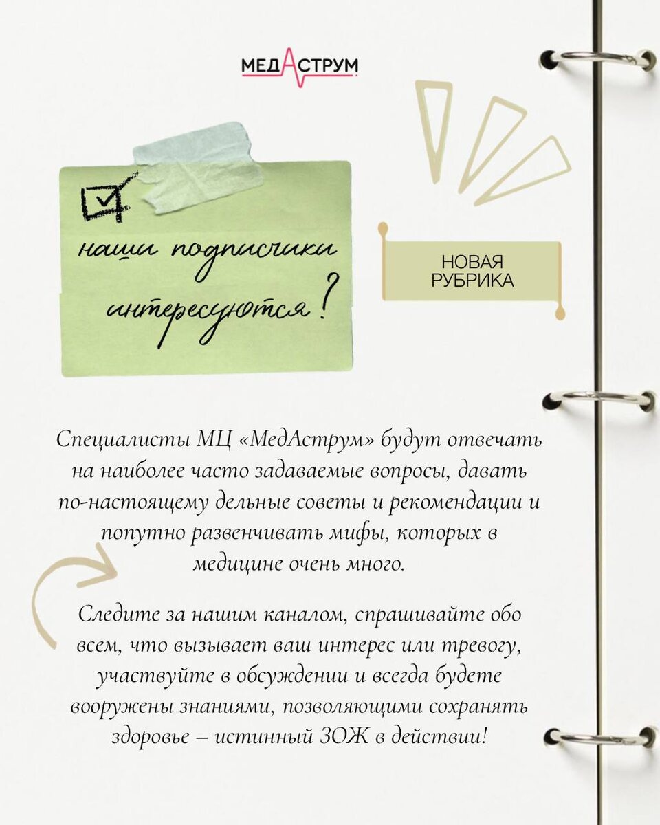 Глубокоуважаемые подписчики нашего канала и пациенты нашего медицинского центра. Мы открываем рубрику – НАШИ ПОДПИСЧИКИ ИНТЕРЕСУЮТСЯ. Специалисты МЦ «МедАструм» будут отвечать на наиболее часто задаваемые вопросы, давать по-настоящему дельные советы и рекомендации и попутно развенчивать мифы, которых в медицине очень много. 🔎 Следите за нашим каналом, спрашивайте обо всем, что вызывает ваш интерес или тревогу, участвуйте в обсуждении и всегда будете вооружены знаниями, позволяющими сохранять здоровье – истинный ЗОЖ в действии!