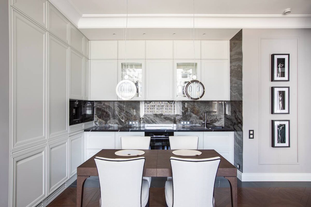 Комплексная меблировка, как искусство: проект, в котором каждая деталь — на своём месте Когда эстетика встречает функциональность, рождается интерьер, в котором хочется жить. Представленный проект от фабрики Rondini — наглядный пример того, как продуманный до мелочей подход к комплексной меблировке способен превратить квартиру в полноценное жилое пространство, где всё подчинено единой философии стиля, уюта и комфорта. Кухонное пространство: элегантность и архитектура симметрии Кухня выполнена в светлой классике с ненавязчивыми декоративными фрезеровками. Строгие линии фасадов гармонируют с глубокой текстурой каменного фартука. Интегрированная техника, точечное освещение, высокие шкафы до потолка — всё говорит о премиальном уровне исполнения. Чёрный глянец варочной поверхности и встроенного кофе-машины подчёркивает благородный контраст с белыми фасадами. Это не просто зона приготовления пищи — это полноценная сцена для кулинарных ритуалов и уютных встреч. Спальня: сочетание натурал