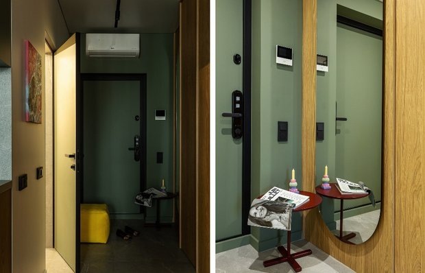 Входная зона получилась одновременно практичной, стильной и запоминающейся Оформление прихожей — важный шаг. Именно она формирует первое впечатление о пространстве, и от неезависит, насколько удобно и радостно жильцам возвращаться домой. В проекте студии 32 м² дизайнер Юлия Поздняк показала, как даже скромную по размеру зону можно превратить в функциональное пространство, задающее настроение всей квартире. Основной прием — работа с цветом. Дверь и одна из стен в прихожей выкрашены в эвкалиптовый зеленый, задающий общую палитру всего интерьера. Подход помогает избежать визуального дробления и делает помещение целостным: прихожая не воспринимается как отдельный коридор, а становится логичным продолжением кухни и гостиной. Но самое смелое решение здесь — яркий акцент в виде желтого пуфа. Он не только удобен (на нем можно присесть, обуваясь), но и работает как яркое «приветствие» — добавляет энергии и немного иронии с первого шага. Пуф поддержан черными деталями — обувной ложкой, рамой две
