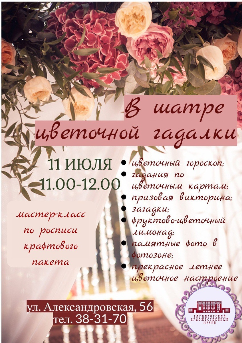 🌟Дорогие друзья! 🌲🍃🌹Уже сегодня, 11 июля, в 11.00 приглашаем всех в наш музейный скульптурный дворик, где снова будет открыт шатер цветочной гадалки. 🍬🥤🪄🎁И взрослым , и детям приготовлено много приятных сюрпризов - гадания на старинных цветочных картах, цветочный гороскоп, викторины с призами, загадки, фото на фоне самых живописных уголков дворика. В жару приятно выпить медово-цитрусового лимонада, который вам предложат в шатре 🎨 Всем, кто любит творить красоту своими руками, предложат принять участие в мастер-классе по росписи крафтового пакета, создать на нем неповторимый цветочный узор. 🏛Ждем всех по адресу: ул. Александровская, 56 Вход через калитку справа от здания музея. ☎️ тел. 8 (8634) 38-31-70