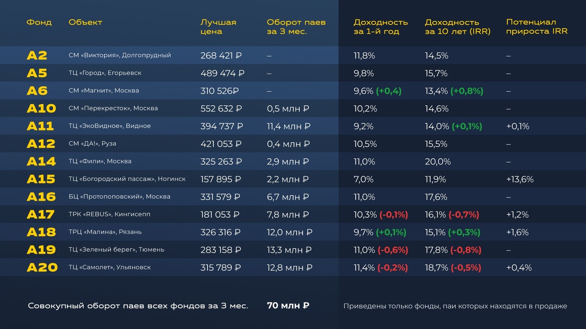 Вторичный оборот паев фондов на 11.07.2025 г. ➡️ Актуальные цены вы найдете в личном кабинете, раздел «В продаже». 🔸 Доходность зависит от цены пая конкретного предложения 🔸 Количество доступных паев ограничено Как происходит расчет показателей, объяснили здесь. — * Настоящее предложение не является публичной офертой #best