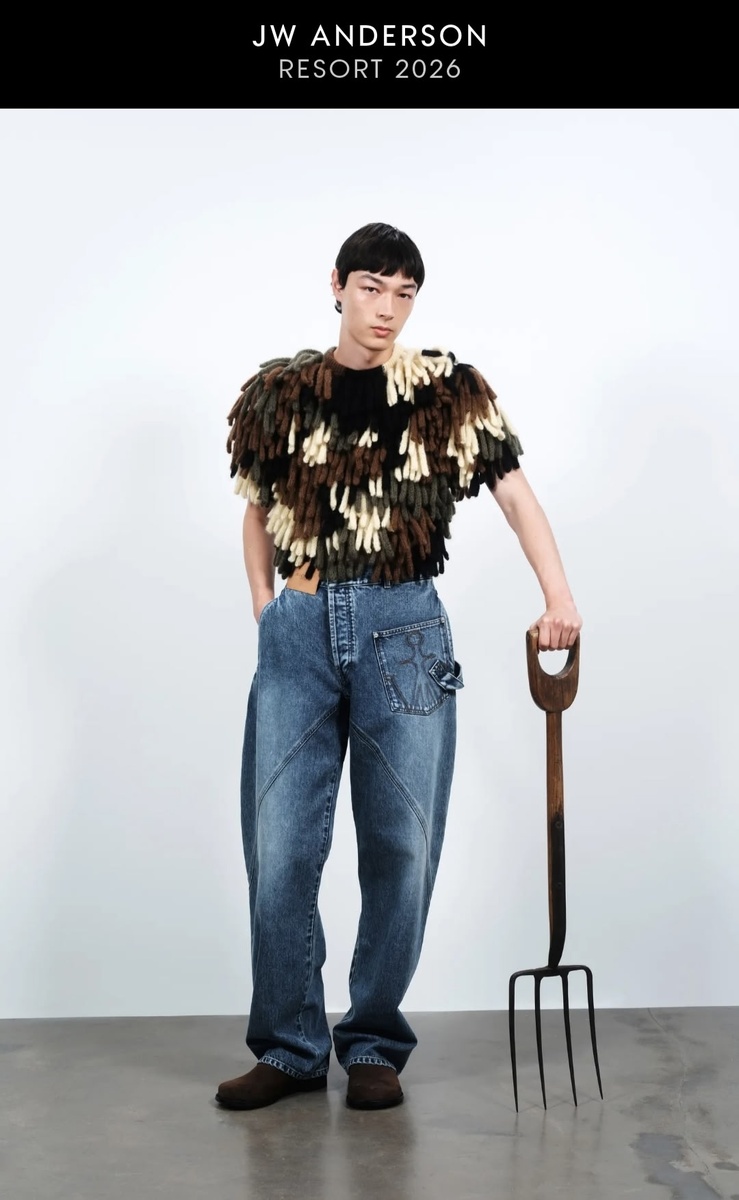 Ручной труд, конечно, облагораживает, как и любой другой. Но когда представила себе, сколько времени нужно, чтобы вывязать каждую из этих висюлек... Мне кажется, оно того не стоит. Сама вяжу, знаю. А JW ANDERSON решил иначе и сделал. Для Resort 2026. Но не о трудозатрстности сейчас. О трудоэкологичности, что ли? Коллекция получилась немножко шаловливой, этакий свободолюбивый водолейский вайб, слегка наплевательская воздушность в подаче. Если у вас строгий дресс-код на работе, конечно, так не оденешься. Однако! Мелкие хулиганские детальки привнести в рабочий костюм и атмосферу вокруг — можно исхитриться. Смотрите сами: Не переборщите, главное. Если вас увидят на рабочем месте с такой винтажной лейкой, а вы не садовод... Впрочем, разве вы должны оправдываться? Но это не вся необычность. Коллекция смешанная — потому что настроение задают и аксессуары, предметы интерьера и обихода, отдельно от луков. Разные чашки в одном стиле. Всегда можно расставить приоритеты