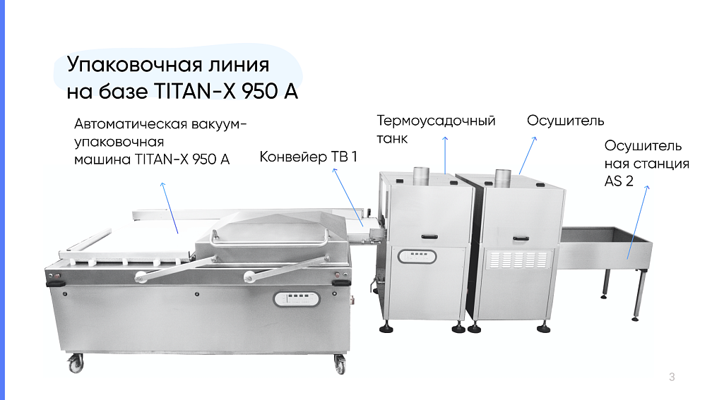 Продукты сегодня должны быть не только свежими и качественными, но и привлекать внимание с первого взгляда. И один из первых помощников в этом – упаковочные линии BOSS VAKUUM на базе TITAN-X 950 A. Отличный вакуум, абсолютная герметичность и яркая упаковка! Автоматическая вакуум-упаковочная машина TITAN-X 950 A. Машина оснащена современной системой управления Z 3000, которая обеспечивает точность и автоматизацию процессов. Автоматический термоусадочный танк ATT 77/7. Используется для термоусадочной упаковки, обеспечивая стабильный температурный режим благодаря мощным нагревательным элементам. Широкий выбор вариантов программирования позволяет задавать индивидуальные настройки для работы с любыми по качеству термоусадочными материалами. Автоматический осушитель Т 1100 A. Разработан для сушки вакуумных упаковок после погружения. Регулируемое воздушное сопло обеспечивает быструю и чистую сушку упаковки. Конвейер ТВ 1. Модульные конструкции, которые могут быть интегрированы в автоматически